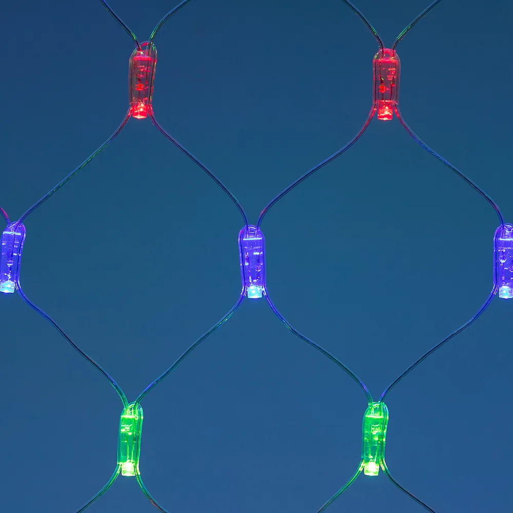 Светодиодная сеть Classic. 2000x1500 (длина 2000 мм, высота 1500 мм). Цвет свечения RGBY (светодиоды чередуются). 288 светодиодов размером 7 мм со статическим и 8 динамическими эффектами свечения с резким световым рисунком (прозрачная вогнутая линза). Провод прозрачный, ПВХ. Питание 230 В, Мощность 18 Вт,защита IP65, применение в помещении и на улице под навесом Аксессуары для подключения и выбора режима свечения в комплекте.