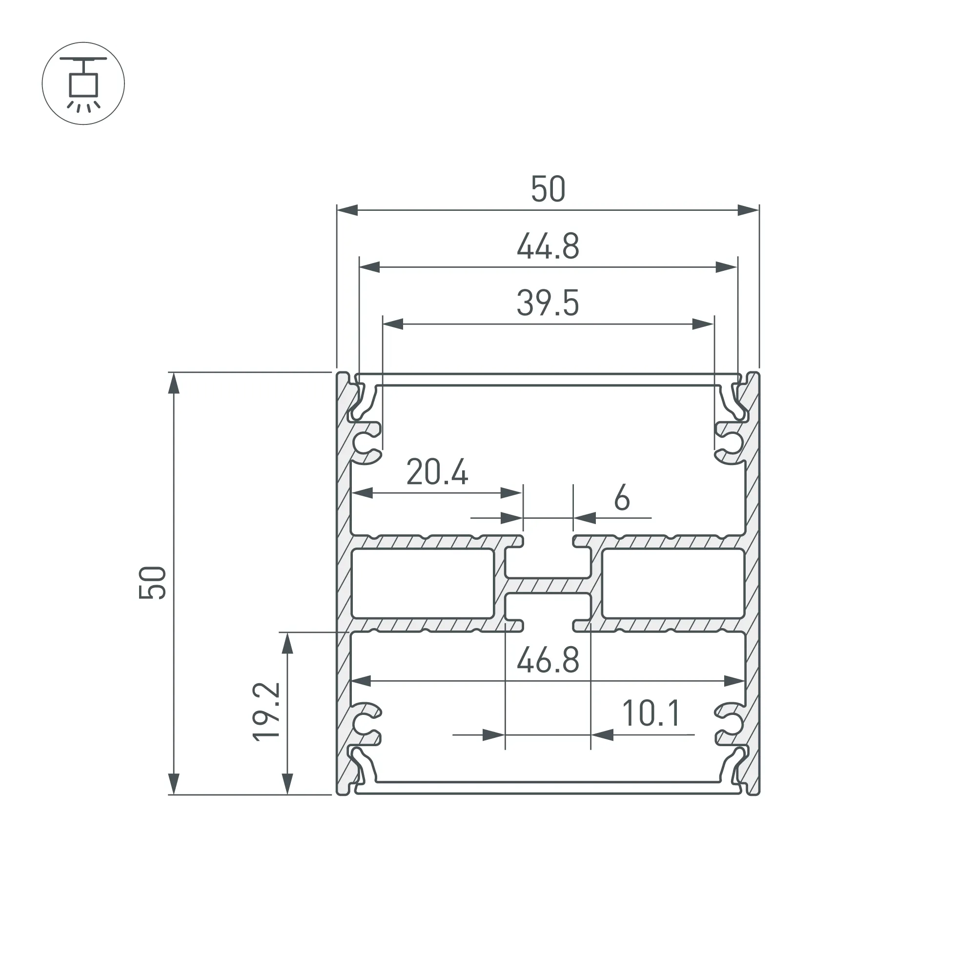 Алюминиевый анодированный профиль для светодиодных лент и линеек, свечение вверх и вниз. Цвет - чёрный. Габаритные размеры (L×W×H): 2000x50x50 мм. Ширина площадок для ленты 46,8 мм. Экраны, заглушки и другие аксессуары приобретаются отдельно. Цена за 1 метр.