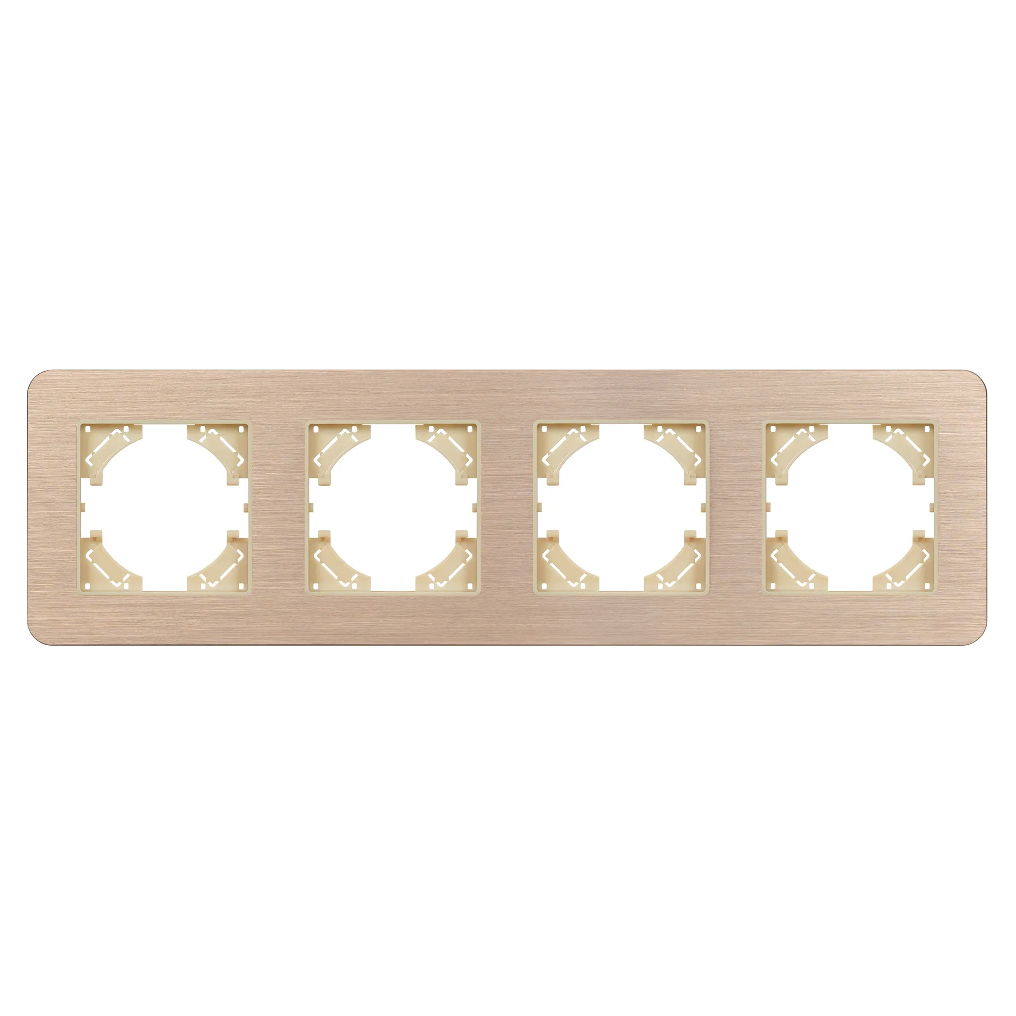 Рамка алюминиевая на 4 поста, под встраиваемый механизм. Цвет - золотой. Уровень герметичности IP20. Ориентация монтажа - горизонтальная (основным ориентиром служат посадочные выступы для накладки механизма).