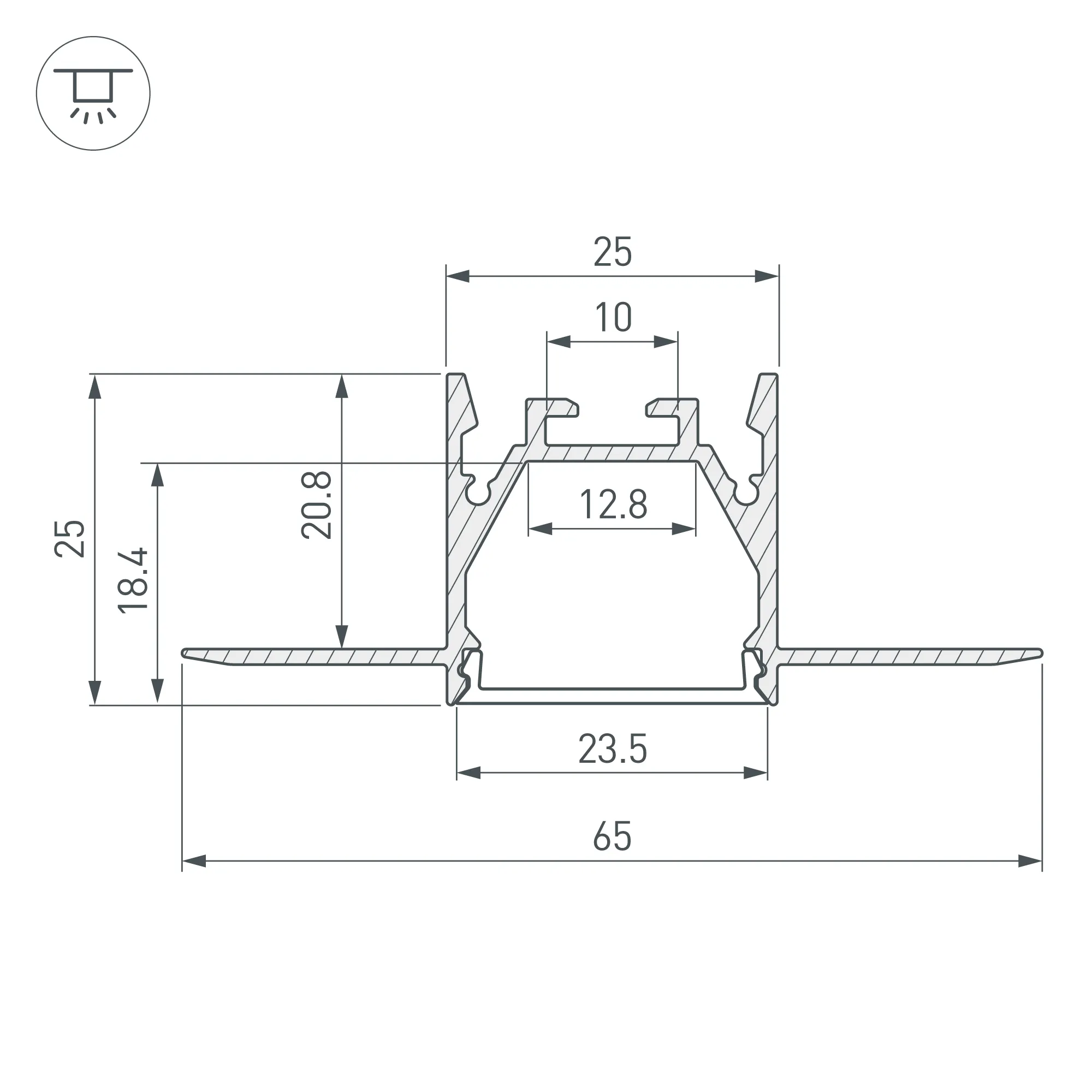 Алюминиевый анодированный профиль для светодиодных лент и линеек. Скрытая установка (под строительную отделку). Цвет - серебристый. Габаритные размеры (L×W×H): 2000x65x25 мм. Ширина площадки для ленты 12,8 мм. Экраны, заглушки и другие аксессуары приобретаются отдельно. Цена за 1 метр.